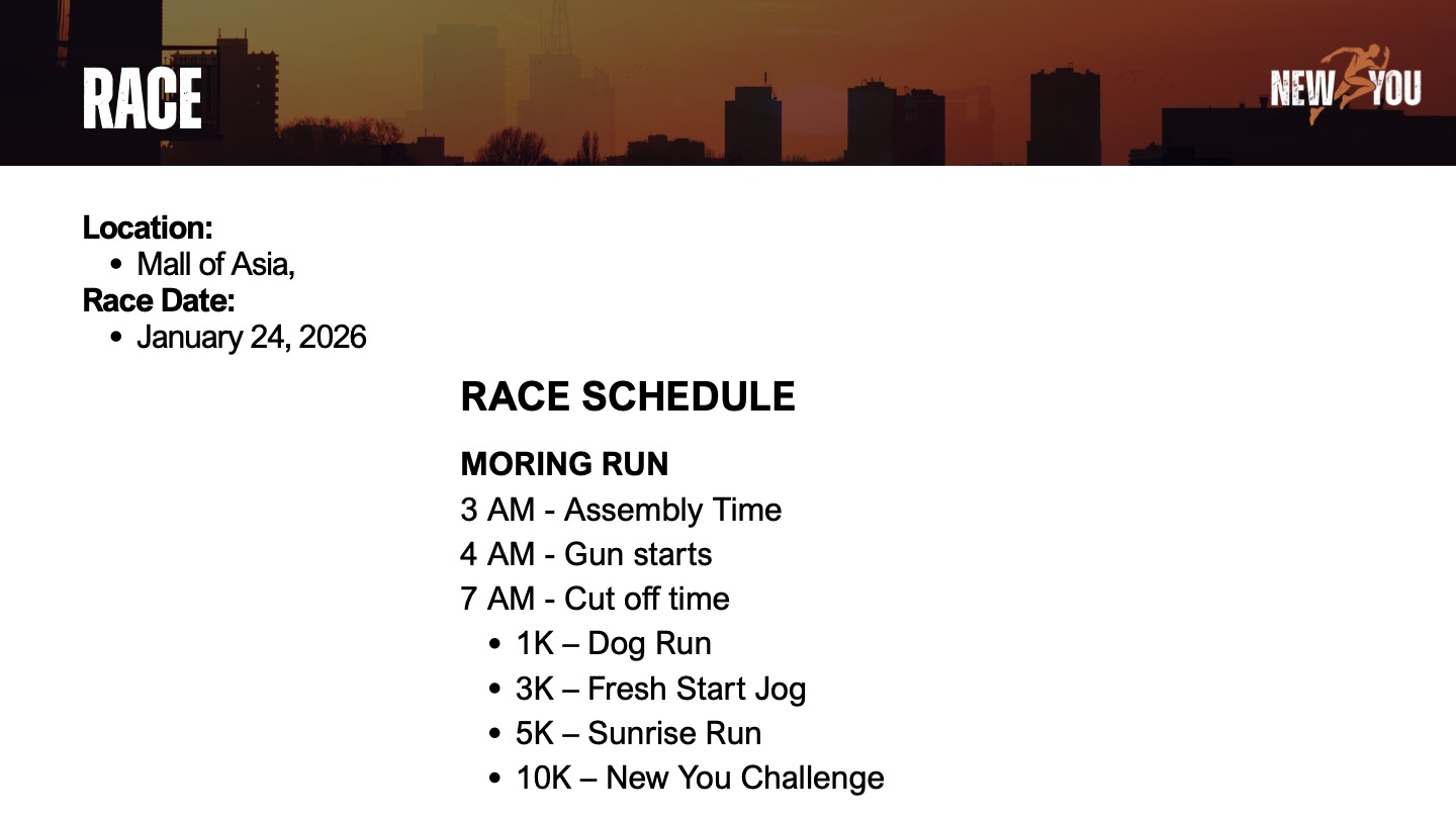 The NEW YOU RUN 2026 is a unique midnight and sunrise charity run designed to symbolize sunrise, fresh starts, and new beginnings. As the clock resets to a new year, we invite runners of all levels to hit the road, chase the dawn, and celebrate a brighter tomorrow.